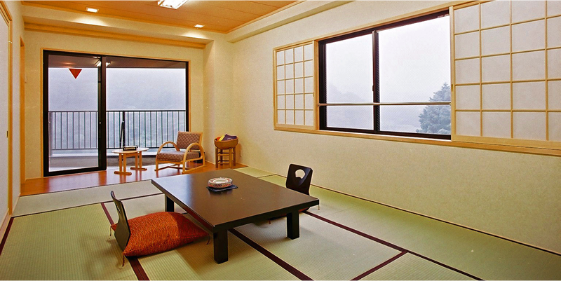 露天風呂付き客室は全10室。全室ほぼ同様の造りとなっており、12帖の和室に露天風呂付きのバルコニーがございます。開放的な入浴をお楽しみいただけます。