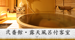 弐番館客室は、バルコニーに “信楽焼(陶器)”の湯船を設置した露天風呂付き客室です。