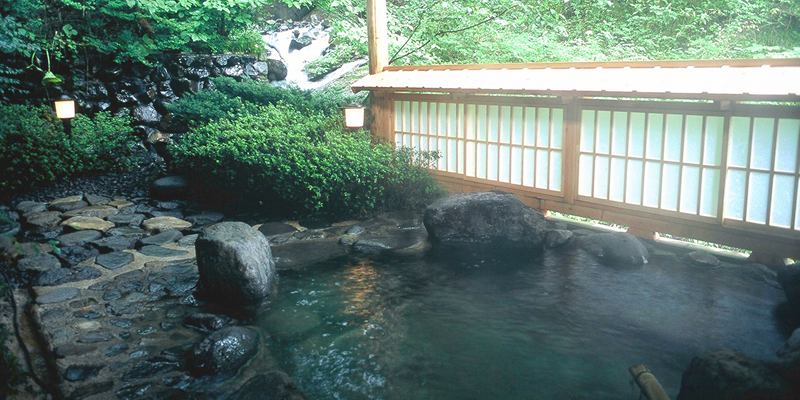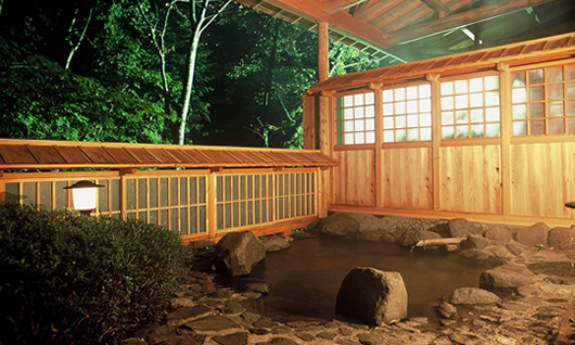 弐番館1階にある大浴場は、男湯女湯それぞれに露天風呂と内湯がございます。露天風呂は自然を感じられる岩風呂、風呂場の横を流れる小さな滝のせせらぎが心地良く身も心も癒してくれます。