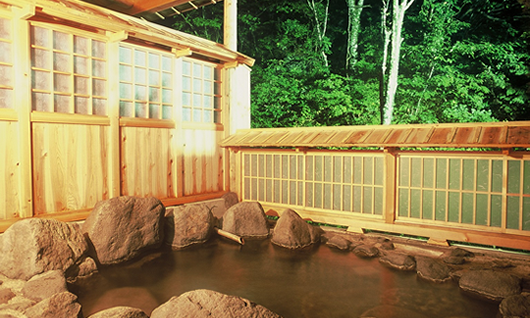 「澤の湯」は男湯。瀧の湯と同様、露天風呂と内湯があります。露天風呂は源泉100%かけ流し、内風呂は源泉かけ流しと循環を併用しております。チェックイン~チェックアウトまで、夜中もご利用可能です。
